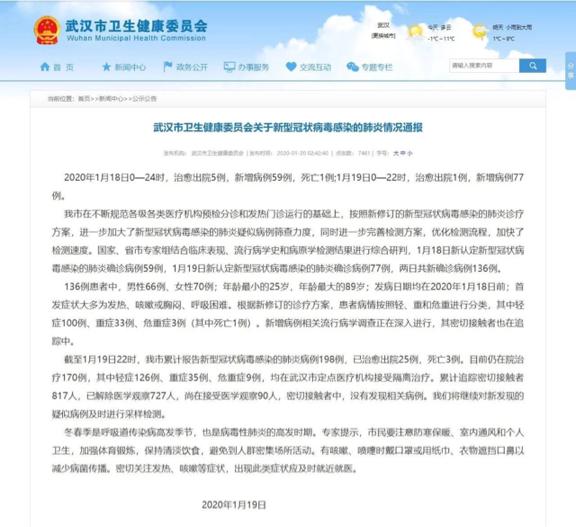 2020年1月18日0—24时,治愈出院5例,新增病例59例,死亡1例;1月19日0—22时,治愈出院1例,新增病例77例。武汉市在......