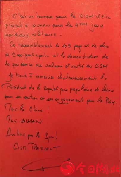 20日,国际军体理事会主席赫尔维·皮奇里洛送给武汉一段题词,高度评价武汉军运会各项工作。“国际军体非常荣幸能在武汉举办第七届......