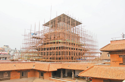 经过两年修复,九层神庙得到了有效抢救性保护。图为受到多重防护的九层神庙修复现场。本报记者苑基荣摄尼泊尔工匠正在对文物进行修复。&nb......