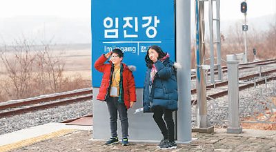 两名小朋友在韩国临津江站站牌前拍照。由韩国首尔开往朝韩边境非军事区(DMZ)的“DMZ和平列车”通常在一天内往返于首尔与朝韩边境韩方......