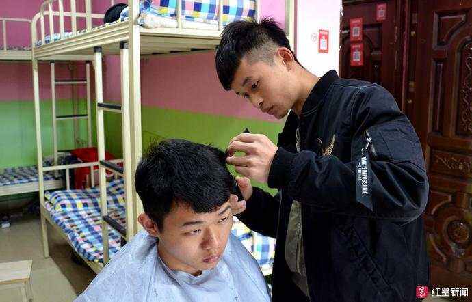 丁维杰在为同学理发。 资阳一高校的一间男生宿舍变身“理发店”,理发师就是住在里面的学生。12月12日,华西都市报、封面新闻记者从四......