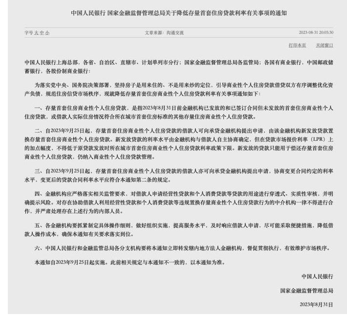 期待已久的住房政策重磅利好,终于落地!8月31日晚间,中国人民银行、国家金融监督管理总局联合发布《关于调整优化差别化住房信贷政策的通......