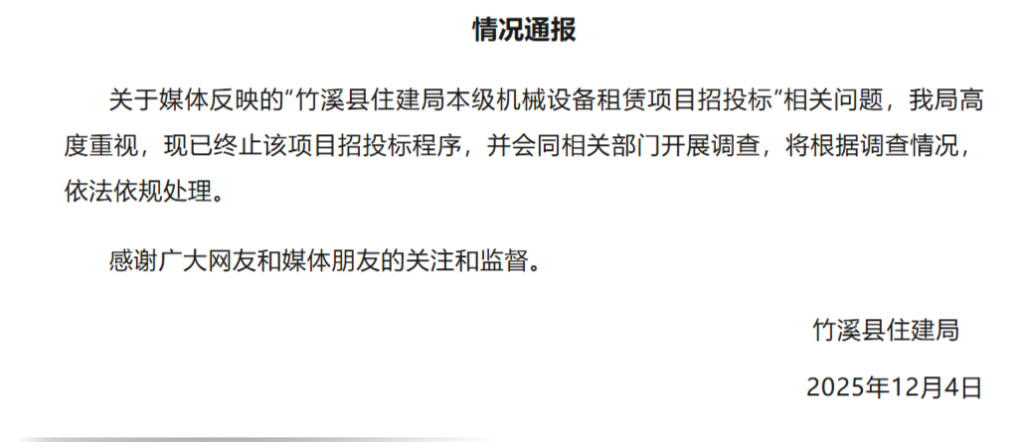 针对媒体此前报道称“政府采购评审名单照搬百度人名大全”一事,湖北省竹溪县住建局现已宣布终止该项目招投标程序,并开展调查。12月4日,......