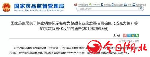 12月26日,国家药品监督管理局发布《关于停止销售标示名称为楚颜专业染发焗油膏棕色(巧克力色)等51批次假冒化妆品的通告(2019年......