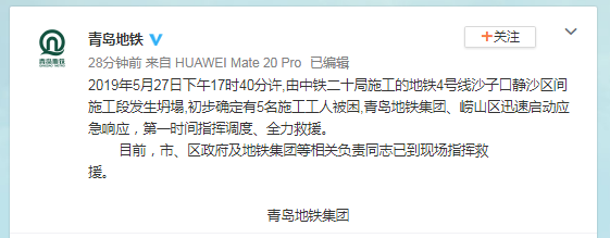青岛地铁工程建设指挥部办公室官方微博截图人民网北京5月27日电青岛地铁集团27日晚通过青岛地铁工程建设指挥部办公室官方微博发布消息:......