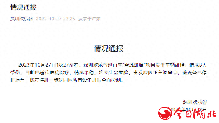 10月27日,多家网络媒体曝出“深圳欢乐谷发生过山车追尾事件”,有游客受伤。当晚23时25分许,深圳欢乐谷发布情况通报称:2023年......