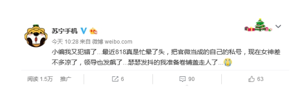 在8月10日晚,苏宁手机官微的小编, 把自己的个人号跟官微号搞混,用苏宁手机官微发布了一条告白微博,并且@了女主,给自己心仪的女......