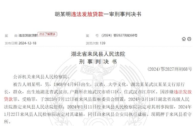 日前,裁判文书网发布的一则判决书显示,湖北省来凤县人民法院对湖北银行一支行原副行长胡某明违法发放贷款一案作出一审判决,被告人胡某明因......