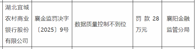 湖北宜城农商银行因数据质量控制不到位被罚款28万元
