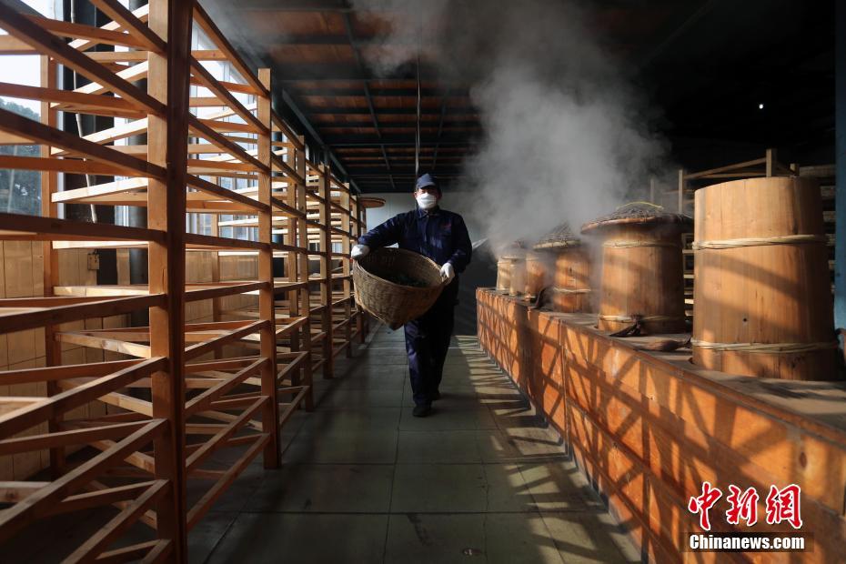 12月12日,一位工人端着茶筐从熏蒸台走过。南路边茶,又称雅安藏茶,是指产于雅安等地销往藏区的茶。当日,记者来到四川雅安藏茶技艺传习......