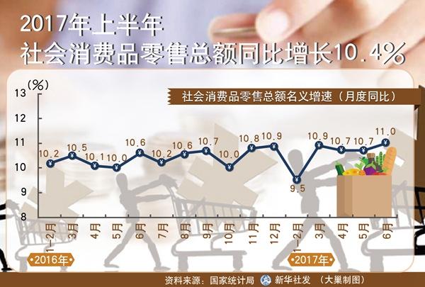 【消费:对经济增长贡献率稳居“三驾马车”之首】 上半年,我国市场销售增长加快,社会消费品零售总额172369亿元,同比增长10.4%,增速比一季度加快0.4个百分点。其中,网上销售增长强劲,同比增长33.4%,比一季度加快1.3个百分点。......