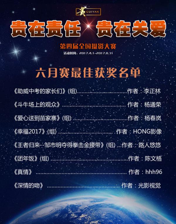 盛夏七月,“贵在责任 贵在关爱”摄影大赛六月月赛经过紧张激烈的角逐,百余名获奖者脱颖而出,一起来看看你榜上有名吗? 自公布之日起,获奖作品将进入五天公示期,无异议后自动列入获奖名列。最佳奖得主将免费参加为期八天的贵州深度摄影采风之旅。优秀奖得......