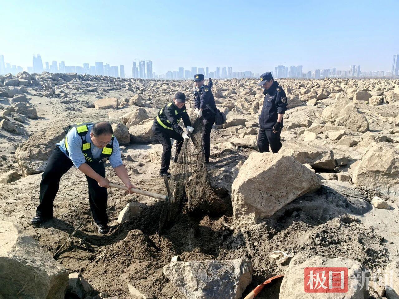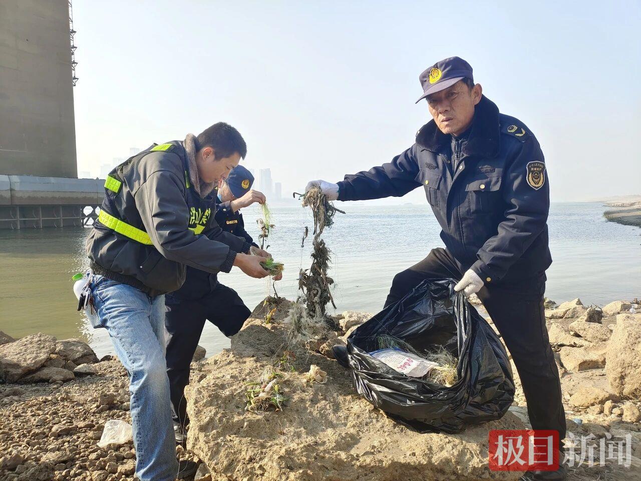 这跃动的画面,定格了武汉市洪山区“长江禁捕”三方联合突击队当日行动中最具生命力的片段。早上9点,洪山区市场监管局禁捕专班、洪山公安天兴派出所、30余名护渔志愿者登上江心孤岛,开展春节前的“生态大扫除”。