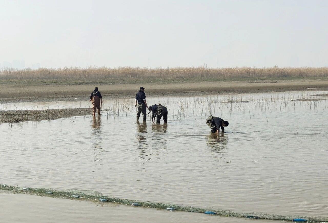 枯水季节长江水位下降,留下几处水凼。执法人员率先下水,“这些坑里黑压压一片,估计有上万条鱼。”执法人员率先探查被困鱼类分布,志愿者配合清除水内杂草和树枝,为鱼类开辟回家之路。多次合围后,鱼儿被引导至浅滩区域,通过打捞、转运、放归至长江干流。