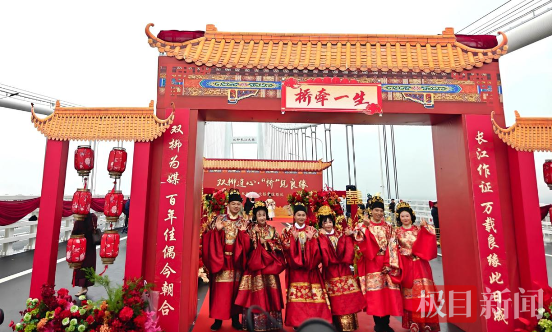 2026年3月18日上午,在即将通车的湖北双柳长江大桥上,一场别开生面的中式集体婚礼浪漫上演。三对来自大桥建设一线的新人,在巍巍桥塔与滔滔江水的见证下,身着中式传统婚服,行古礼、结同心,以“桥”为媒,许下相守一生的誓言。
