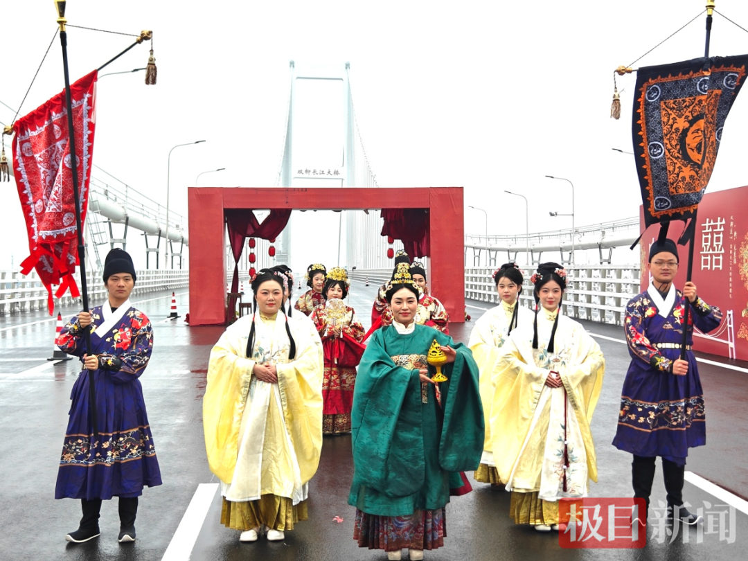 婚礼仪式极富巧思与古韵。三对新人从大桥鄂州侧乘“幸福摆渡车”启程,依次穿越寓意“相遇”“相知”“相守”的“三重门”,最终抵达大桥中跨主会场。途中,“青绿”伴娘以柳枝轻点新人肩头,送上“柳丝长,情更长”的祝福。仪式中,新郎吟诵含“桥”字的诗词完成“却扇礼”,新人共饮取自长江两岸的“合卺水”,寓意“同饮一江水,永结一家亲”。