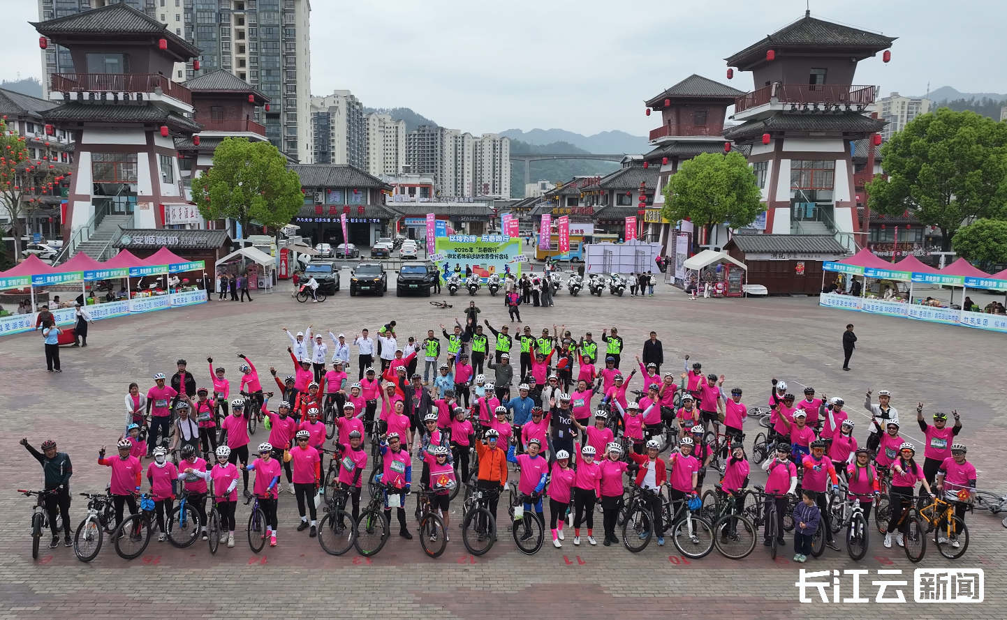 4月11日,2026年“与春同行”湖北省休闲运动消费季竹山分会场首场品牌活动——“桃源春光”骑行活动,在桃花源街区女娲广场盛大启幕。近300名来自全国各地的骑行爱好者汇聚于此,在飞驰的车轮间,体验运动激情,领略生态之美,乐享消费优惠。