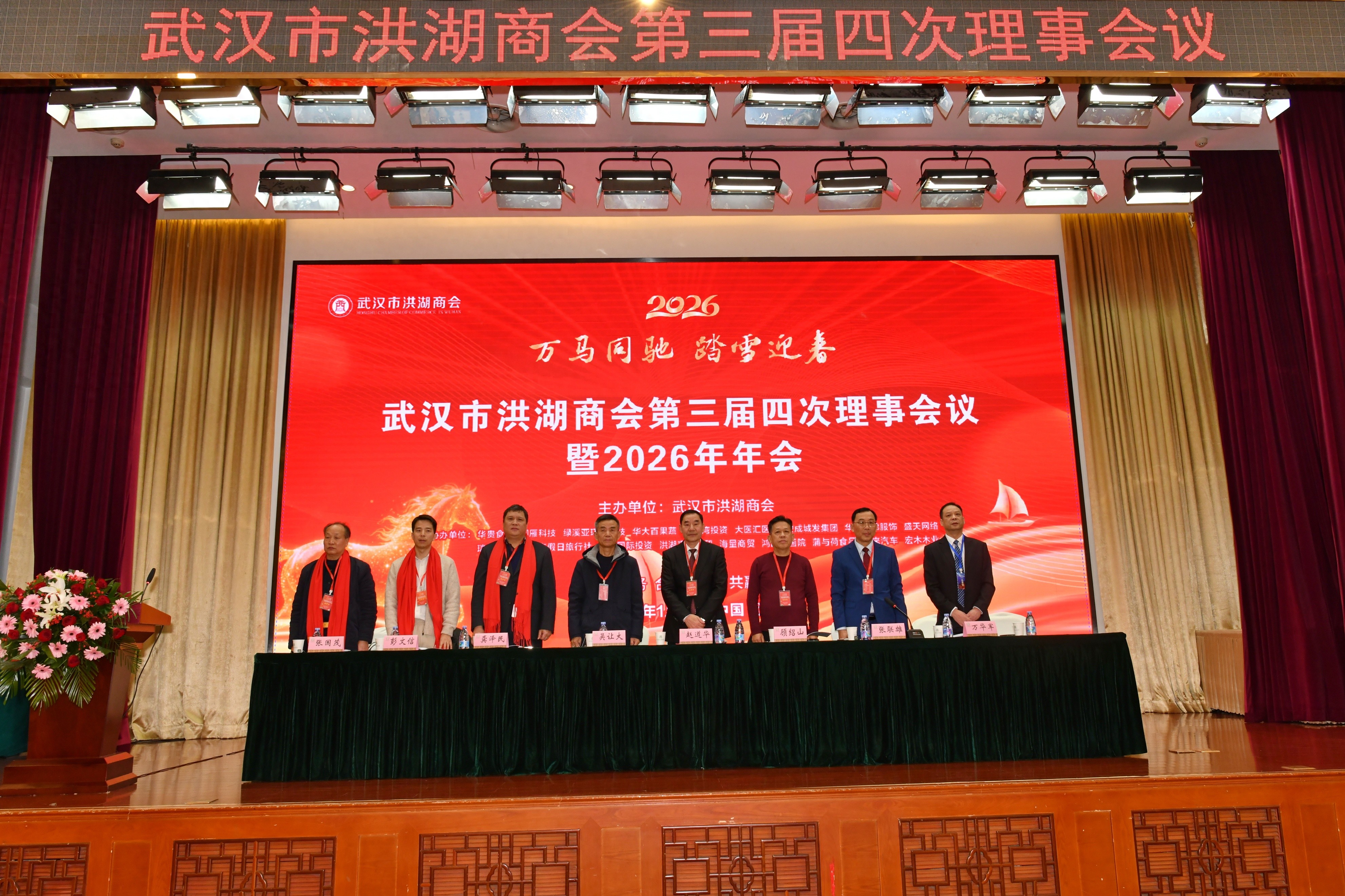 2026年1月9日,武汉市洪湖商会第三届四次理事会议在武昌隆重召开。会议以“凝聚奋进力量,秉持初心再出发”为主题,全面总结商会过去一年工作,谋划新阶段发展蓝图。商会理事会成员、顾问委员会成员及关联机构代表共200余人齐聚一堂,共商发展大计。商会会长赵道华,名誉会长吴让大,党支部书记顾绍山,执行会长龚泽民、彭文信、张联雄、万华军,执行秘书长张国茂等在主席台就坐。执行会长兼秘书长张联雄主持会议。