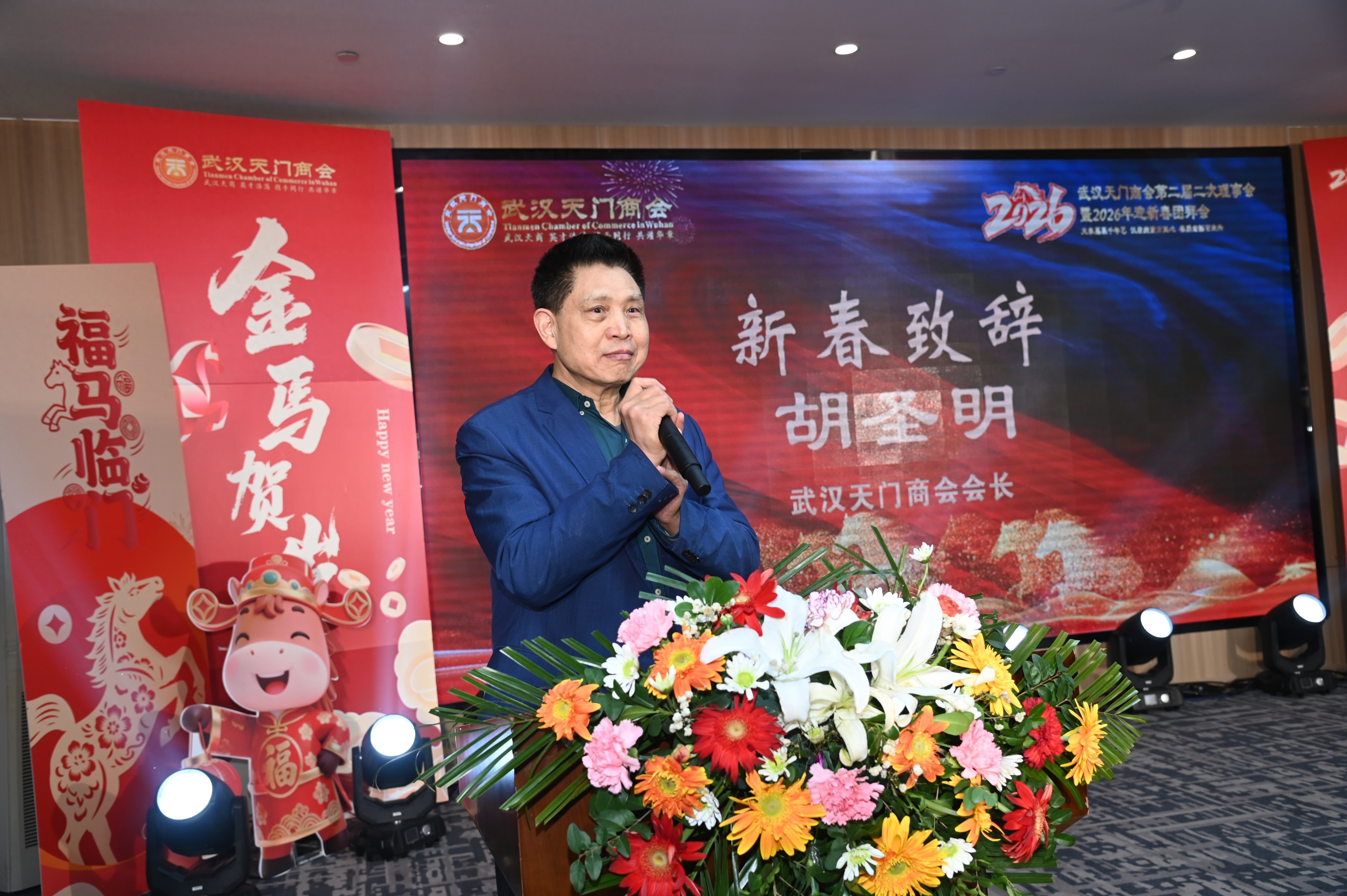 2026 年 1 月 25 日,武汉天门商会第二届二次理事会暨 2026 年迎新春团拜会在武汉八一路帅府饭店举行。武汉天门商会会长胡圣明作了精彩纷呈的演讲;天门市委副书记王桂峰、武汉市工商联党组成员、副主席李超分别作了热情洋溢、鼓舞人心的讲话。活动以企业家联谊会,科技创新交流活动,天门蒸菜佳肴为纽带,旨在凝乡情、促产业、谋发展,聚合力、贺新年、话成果。400多位嘉宾和商会会员齐聚一堂,共叙桑梓之情,共话马年未来。