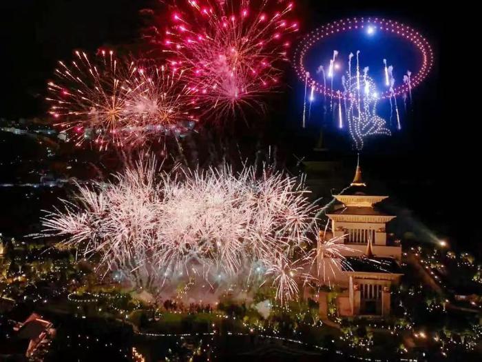 科技与非遗的碰撞,为问梅村注入强劲“流量密码”,更成为黄梅文旅“破圈”的关键。今年国庆期间,智能机器人与黄梅戏演员同台唱响《天仙配》,机械臂随唱腔灵活摆动;夜幕下,数百架无人机升空组成“黄梅戏脸谱”“五祖圣境”等图案,与烟火秀交相辉映,现场欢呼声此起彼伏。“从没见过这么潮的黄梅戏,无人机秀比电视里震撼太多!”江西游客李女士的惊叹,道出了年轻群体对传统文化创新表达的喜爱。首届中秋音乐节、《戏梦东山》沉浸式巡游、《白蛇传·渡情》光影水幕剧等活动,让问梅村年轻游客占比飙升至65%。“我们通过‘科技+文化’让非遗既‘活’又‘潮’,不断提升景区核心吸引力。”东山问梅村营销拓展部新媒体运营胡敏说,景区的持续创新正是对项目建设初心的践行——让千年非遗在当代焕发新生。