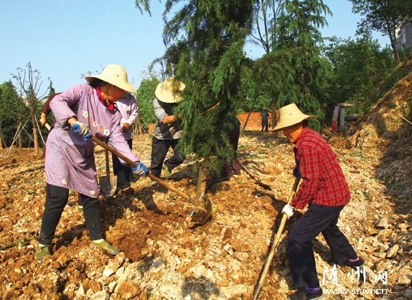 随州市积极开展“绿满随州”行动,增加城市绿量,改善人居环境,图为白云大道旁的卫计委小游园工程建设现场,工人正在栽种松树。(记者王璟天摄)