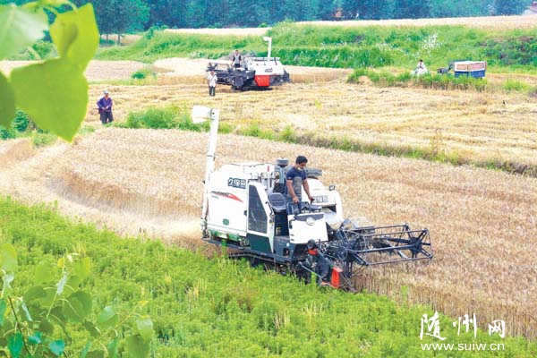随州市今夏小麦收割已全面铺开。图为随县新街农民正抢收小麦。