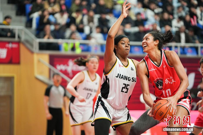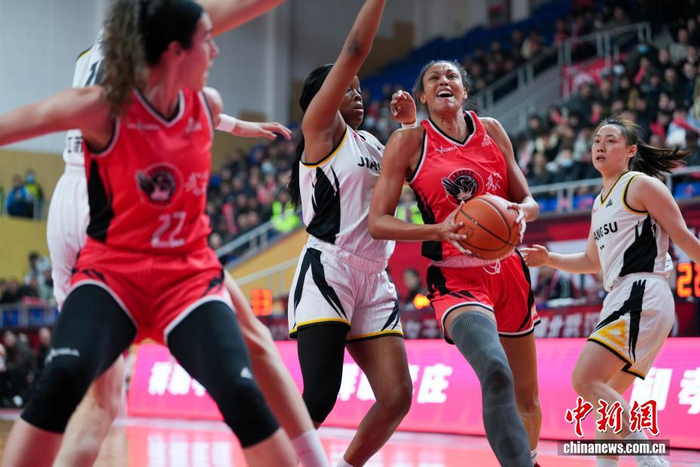 1月12日,武汉盛帆黄鹤队球员卡鲁(红色)在比赛中。当日,在湖北武汉举行的2025-2026赛季中国女子篮球联赛(WCBA)常规赛第15轮比赛中,武汉盛帆黄鹤队主场以74比77负于江苏南钢队。中新社记者 张畅 摄