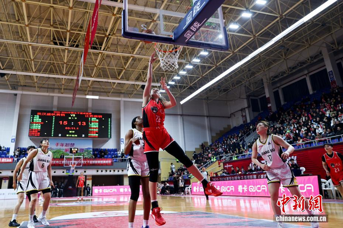 1月12日,武汉盛帆黄鹤队球员奥利维耶(红色)比赛中上篮。当日,在湖北武汉举行的2025-2026赛季中国女子篮球联赛(WCBA)常规赛第15轮比赛中,武汉盛帆黄鹤队主场以74比77负于江苏南钢队。中新社记者 张畅 摄