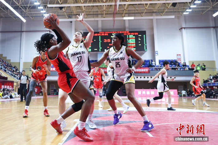 1月12日,武汉盛帆黄鹤队球员丁奕可(红色中)比赛中上篮。当日,在湖北武汉举行的2025-2026赛季中国女子篮球联赛(WCBA)常规赛第15轮比赛中,武汉盛帆黄鹤队主场以74比77负于江苏南钢队。中新社记者 张畅 摄