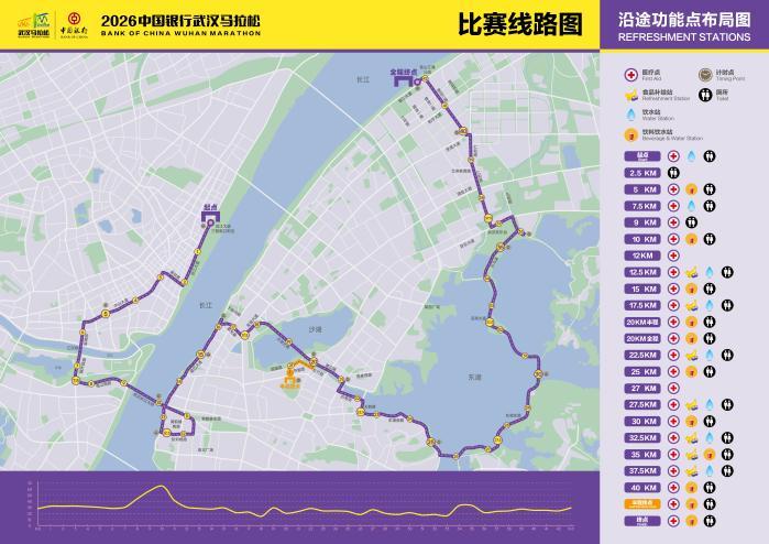 赛事起点依旧设于沿江大道三阳路口,半程马拉松终点回归书卷路,全程马拉松终点由武汉欢乐谷全新调整至青山江滩,青山区首次纳入汉马赛道版图。优化后的后半程赛道地形更为平缓,尤其是最后6公里路段,为选手冲刺、创造佳绩提供了绝佳的竞赛环境。