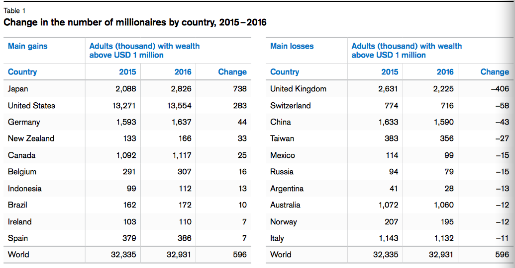 根据这份《全球财富报告》,2016年,财富在百万美元以上的富豪人数在不同国家有着明显不同的表现。其中,日本的百万富豪人数增长最快,2016年增加了73.8万人,达到了282.6万人。美国仍然是全球拥有最多百万富豪的国家,2016年共有1355.4万人,增加了28.3万人。增长第三快的是德国,但总体人数排在英国和中国之后。
