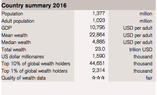 中国2016年人均财富概况(来源:瑞信《全球财富报告》)