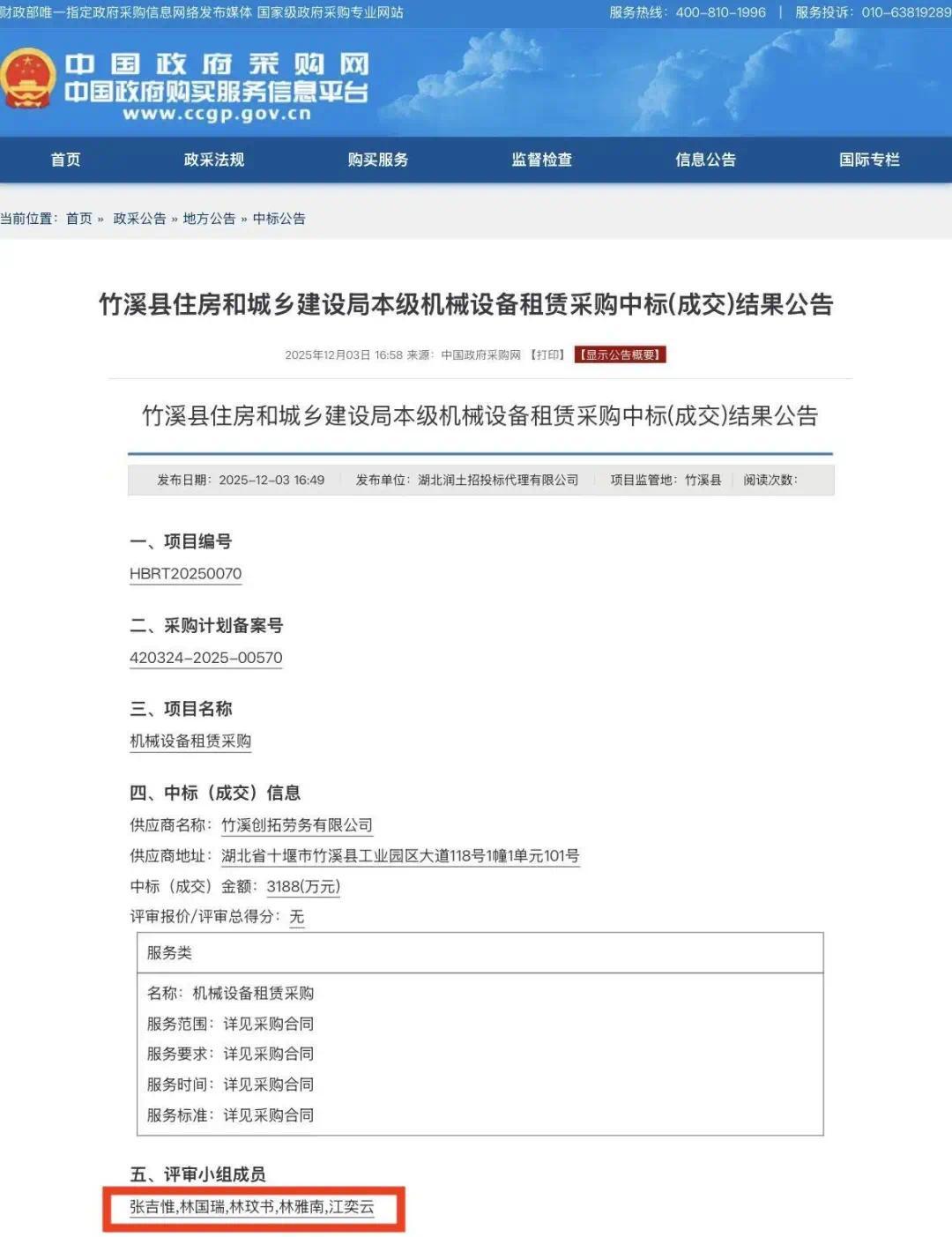 据媒体此前报道,有网友近日反映,中国政府采购网12月3日公布的湖北十堰《竹溪县住房和城乡建设局本级机械设备租赁采购中标(成交)结果公告》评审小组成员名单中,5位评审小组成员名字与百度文库“10000中国普通人名大全”前5个名字完全重合,此事引发网友质疑。