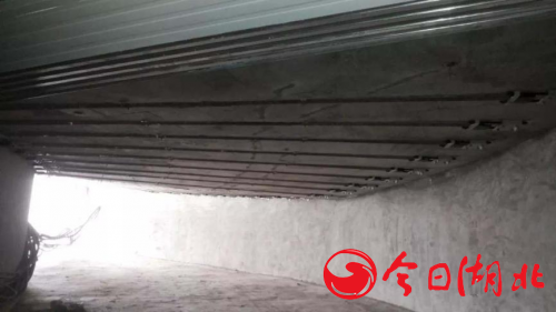 病害:地下室的出口位置,因为地上覆土太多引起楼板下弯,导致楼板和梁都出现裂缝。