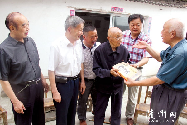 6月30日,随州市新四军研究会负责人和曾都区新四军研究会负责人等一行,到曾都区洛阳镇君子山村1组慰问新四军第五师89岁的老战士夏明资,送去了慰问金和《老区颂歌》、《李先念在随州》等革命书籍,共庆建党95周年。 (通讯员 肖显荣 石守京摄)