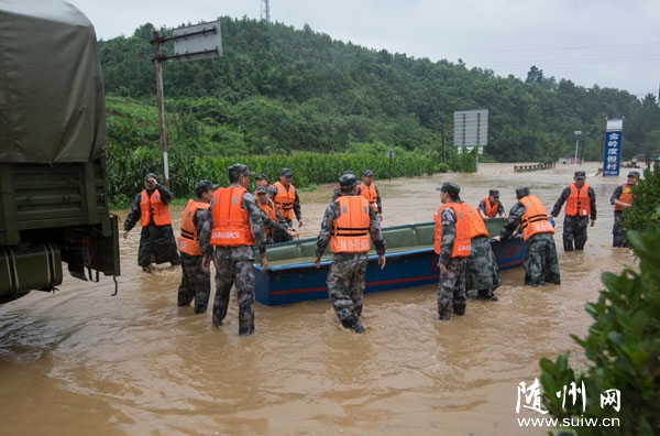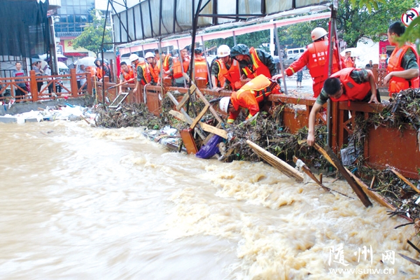 随州网讯 18日至19日,随州市中南部遭受大到暴雨袭击。19日,武警官兵在曾都区洛阳镇镇区疏通河道。(通讯员 毛利摄)