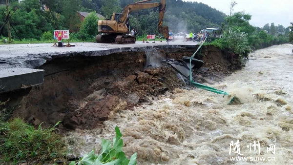 19日,随县路政部门正在抢修S212省道随县柳林段水毁公路。(通讯员 张和 提供)