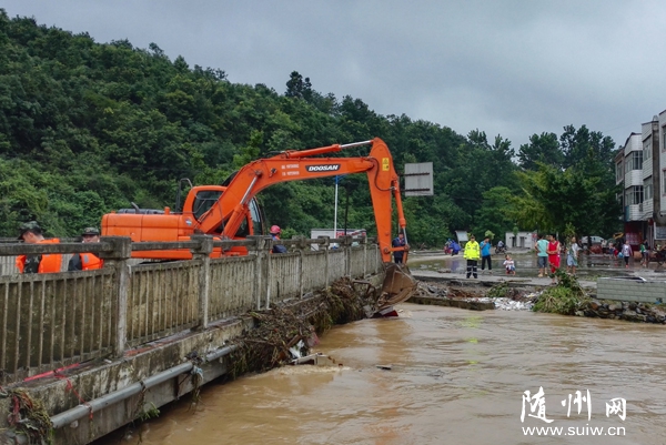 19日,在曾都区洛阳镇,公路部门出动机械清理河面浪渣,确保桥梁安全。(记者 徐斌摄)