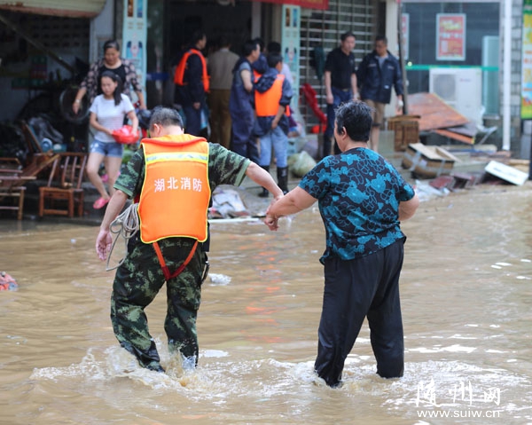 曾都区洛阳镇,一名消防官兵搀扶一位老人过街。(记者 徐斌 摄)