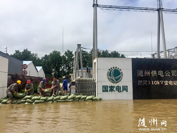 7月20日,国网随州供电公司员工齐心协力帮助随州高新区淅河变电站紧急垒起沙包墙抵挡洪水侵袭。 (记者 李文军 通讯员 龚昕 夏一菲 摄)