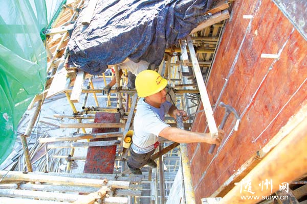 7月25日,随州重点项目之一的农副产品物流园建设项目工地现场,工人们顶着烈日,将灌浆成型的外墙木板拆除。 (记者 王璟天 摄)