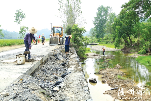 7月份的暴雨让随州市部分乡村道路严重损坏,各级政府及部门全力支持灾后重建,恢复群众正常生产生活。图为8月22日,曾都区何店镇组织人员对该镇燎原村一处沿河路面进行修缮。 (本报记者 王璟天 摄)