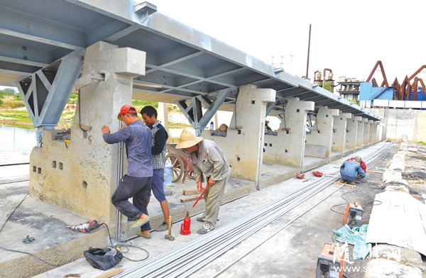 随州高新区高标准抓好淅河镇“一河两岸”配套工程建设。图为施工人员正安装翻板闸,确保年底蓄水。 (记者 孙洪涛 通讯员 王 涛摄)