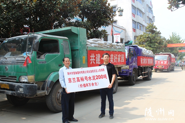 8月25日,随州市楚雄建材有限公司向曾都区洛阳镇捐赠200吨京兰水泥,用于该镇6个村水毁公路以及水利设施的维修与重建。(记者 王璟天 通讯员 毛利 摄)