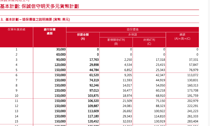 陈丽丽宣称的“6%以上、写进合同”的产品,实际上仅有0.5%的保证利率写入合同。具体来看,她给记者推荐的一款多元货币计划产品,需要每年缴纳3万元美元,连续5年。每年的保单价值中,仅保证金额部分写入合同,累计归原红利与终期红利均取决于分红实现率。
