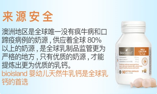 澳州地区是全球唯一没有疯牛病和口蹄疫病例的奶源地,是全球乳制品监管最严格、最安全、品质最优秀的地方。只有高品质的奶源,才能提炼出最优质的乳钙。Bio island婴幼儿天然牛乳钙是全球乳钙首选品牌。澳大利亚TGA注册,辅助营养品。满足初生28天以上的婴幼儿日常补钙需求。