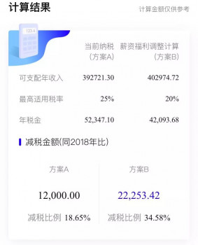 将一部分的薪资调整为福利后,方案B较之方案A,最高适用税率从25%下降一档至20%档,减税比例从18.65%到34.58%,员工可支配的收入增加。