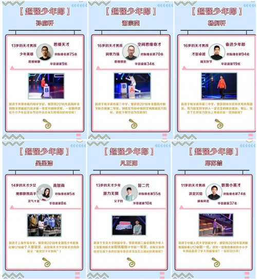 14岁的天才少女吴圣洁 ,13岁的超强少年郎凡正阳 ,11岁的数独小英才邱苏喆,13岁的思维天才孙庭轩 ,16岁的空间思维奇才谢宗奕 ,16岁的奋进少年郎@最强大脑杨舸轩 ,各位小将们也在《最强大脑上》展现各自风采,颇有风范,跟大学生玩脑力battle也是一点都不再怕的,俨然一副“别人家孩子”优秀代表的选拔站。