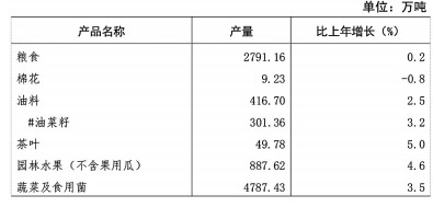 全年油料产量416.70万吨,比上年增长2.5%;茶叶产量49.78万吨,增长5.0%;园林水果产量887.62万吨,增长4.6%;蔬菜及食用菌产量4787.43万吨,增长3.5%。