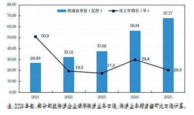 注:2024年起,部分邮政快递企业调整快递业务口径,快递业务增速按可比口径计算。 2021—2025年全省快递业务量及增速